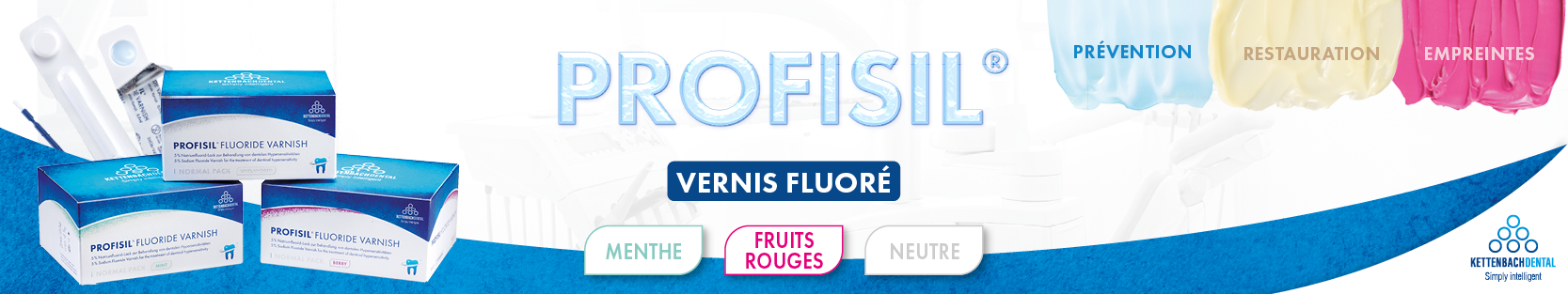 Produit Par Kettenbach Dental le 27-04-2026Dans le domaine de la prévention bucco-dentaire, l’efficacité et le confort du patient sont essentiels. Profisil® Fluoride Varnish s’impose comme une solution innovante grâce à sa formule à base de gel de diméticone contenant 5 % de fluorure de sodium (22 600 ppm). Ce vernis fluoré adhère immédiatement à la surface des dents, sans nécessiter de séchage préalable, et libère des ions fluorure jusqu’à 24 heures.