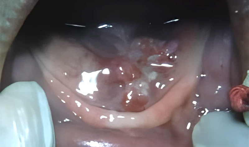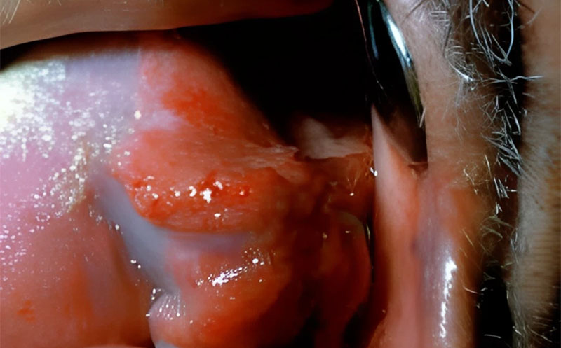 Forme ulcérée en « feuillets de livre ». Importance de bien déplier les muqueuses lors de l’examen et d’écarter la langue.